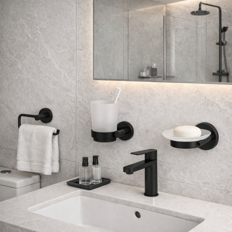 Acest set de 6 piese, realizat din alamă cu finisaj negru, este soluția ideală pentru cei care își doresc o amenajare unitară și sofisticată. Fiecare piesă este proiectată cu linii fluide și accente de sticlă satinată, aducând o notă de strălucire discretă și un sentiment de ordine impecabilă în sanctuarul tău de relaxare.
