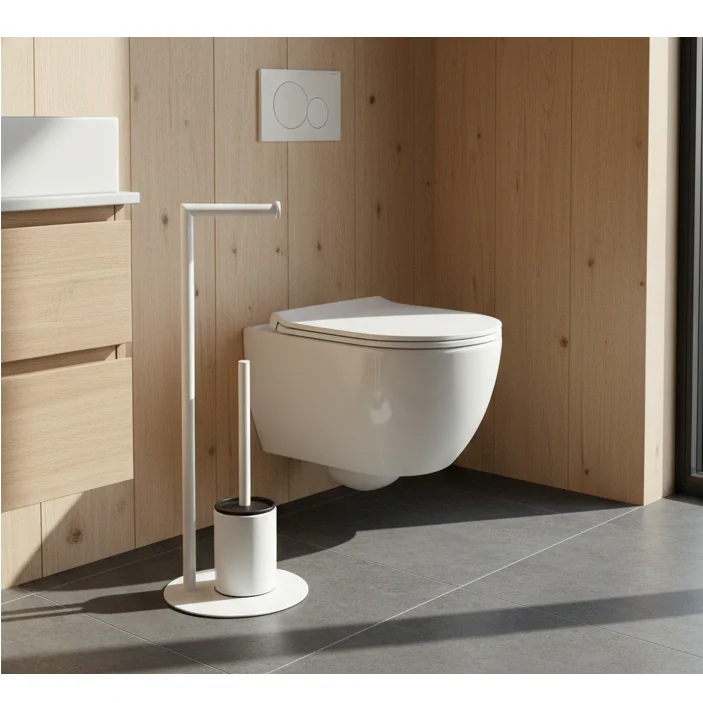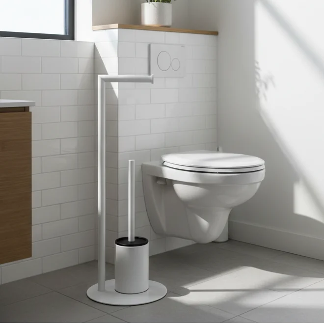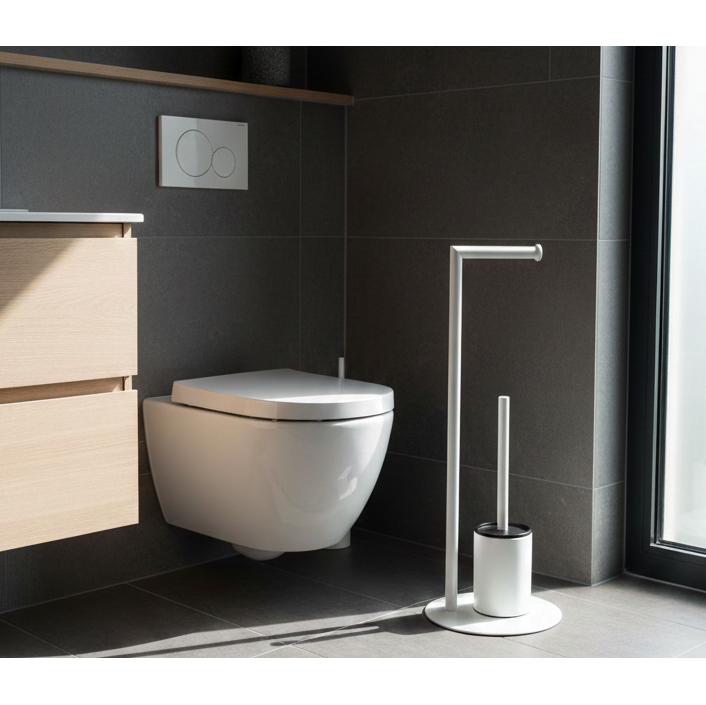 Acest set 2-în-1, format din suport de hârtie și perie de toaletă, este soluția ideală pentru cei care își doresc o baie organizată, fără a compromite stilul. Realizat din inox cu finisaj alb, setul devine un punct sofisticat, potrivindu-se perfect atât într-un decor industrial, cât și într-unul contemporan sau scandinav.