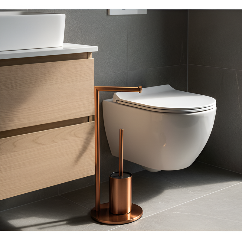 Acest set 2-în-1, format din suport de hârtie și perie de toaletă, este soluția ideală pentru cei care își doresc o baie organizată, fără a compromite stilul. Realizat din inox cu finisaj bronz, setul devine un punct sofisticat, potrivindu-se perfect atât într-un decor industrial, cât și într-unul contemporan sau scandinav.