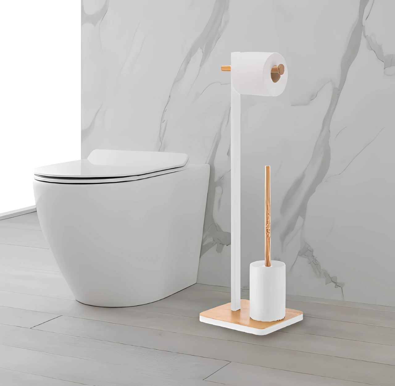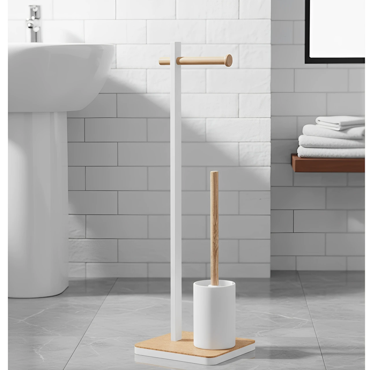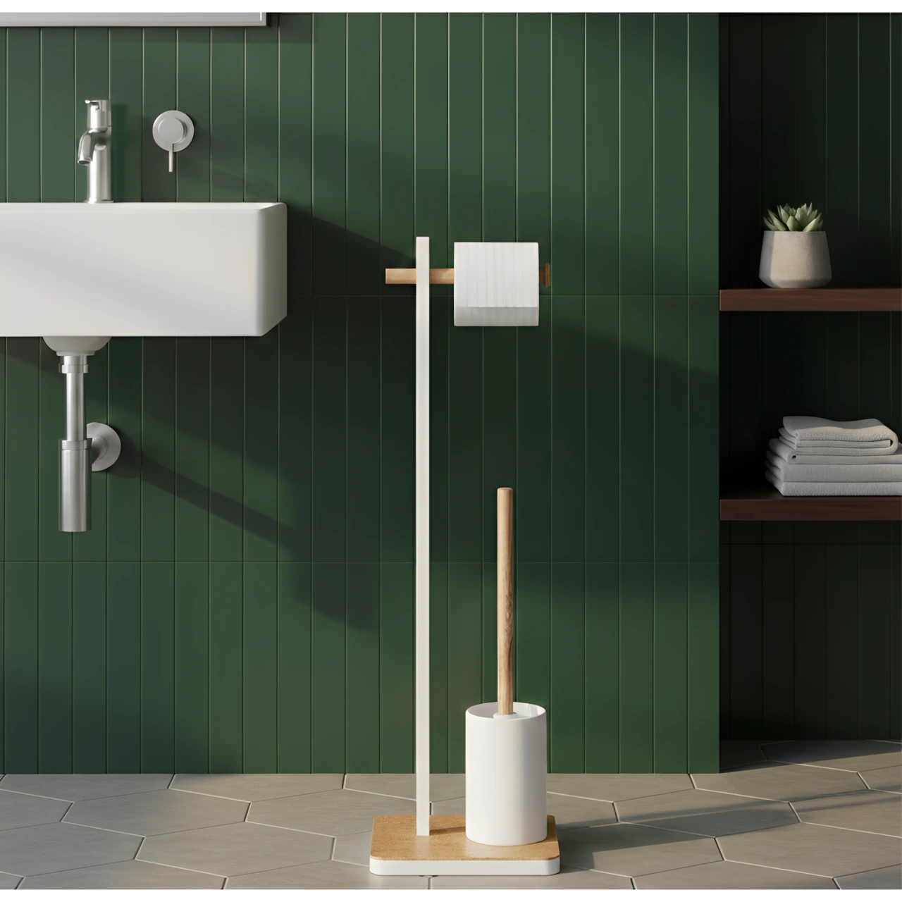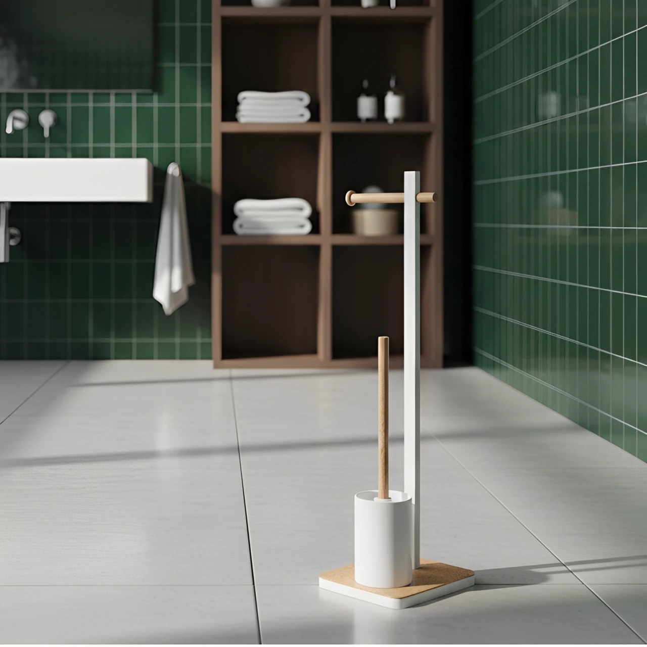 Acest set stativ este soluția ideală pentru cei care își doresc o organizare impecabilă fără a recurge la găurirea pereților. Combinația elegantă de alb și accente de bambus natural transformă un obiect pur funcțional într-o piesă de decor discretă, care aduce o notă de prospețime și ordine în orice spațiu sanitar.