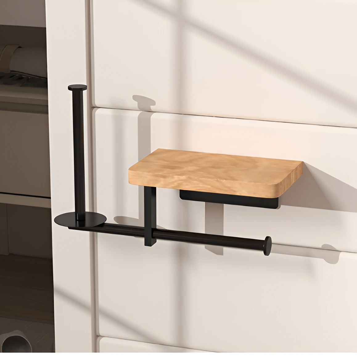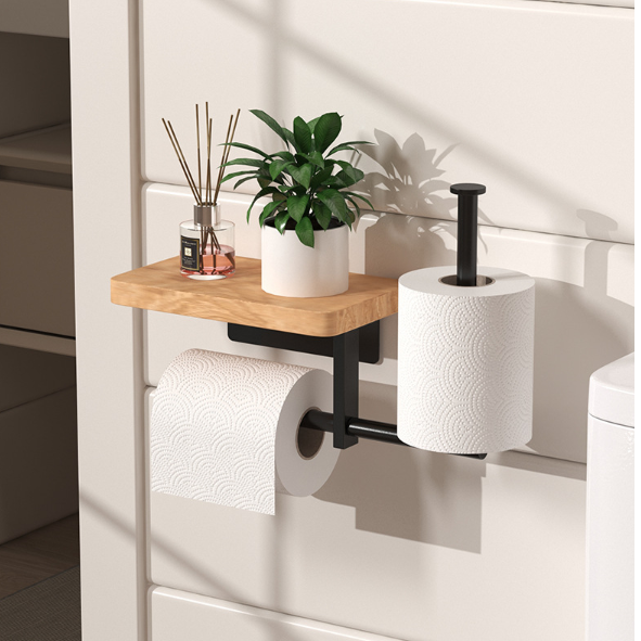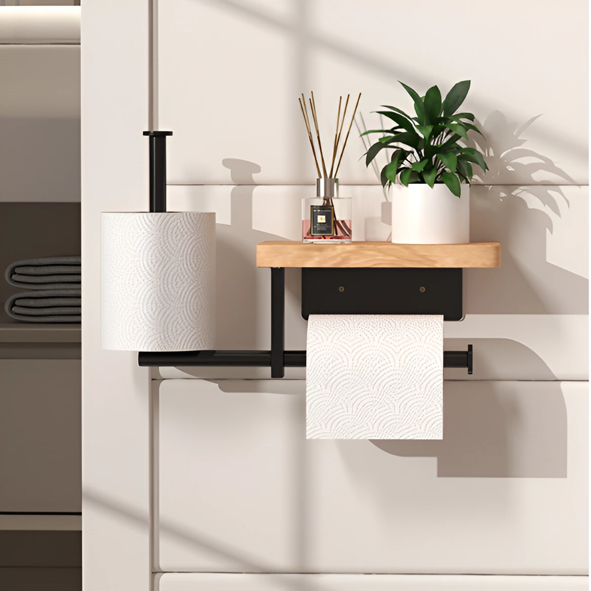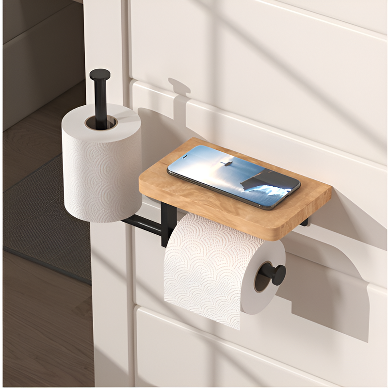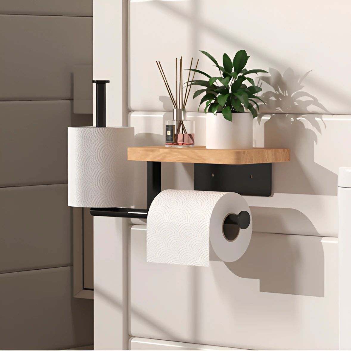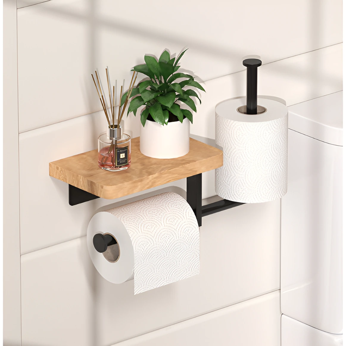 Spune adio dezordinii din baie și bun venit eficienței cu acest suport! Combinația elegantă de metal negru mat și poliță din lemn adaugă rafinament oricărui spațiu, oferind, în același timp, o soluție inteligentă de stocare 3-în-1: rolă curentă, spațiu pentru rola de rezervă și o poliță utilă. În plus, ai flexibilitatea de a alege între montarea rapidă cu adeziv (fără găuri) sau fixarea cu șuruburi.