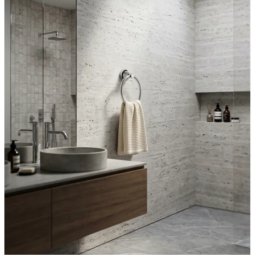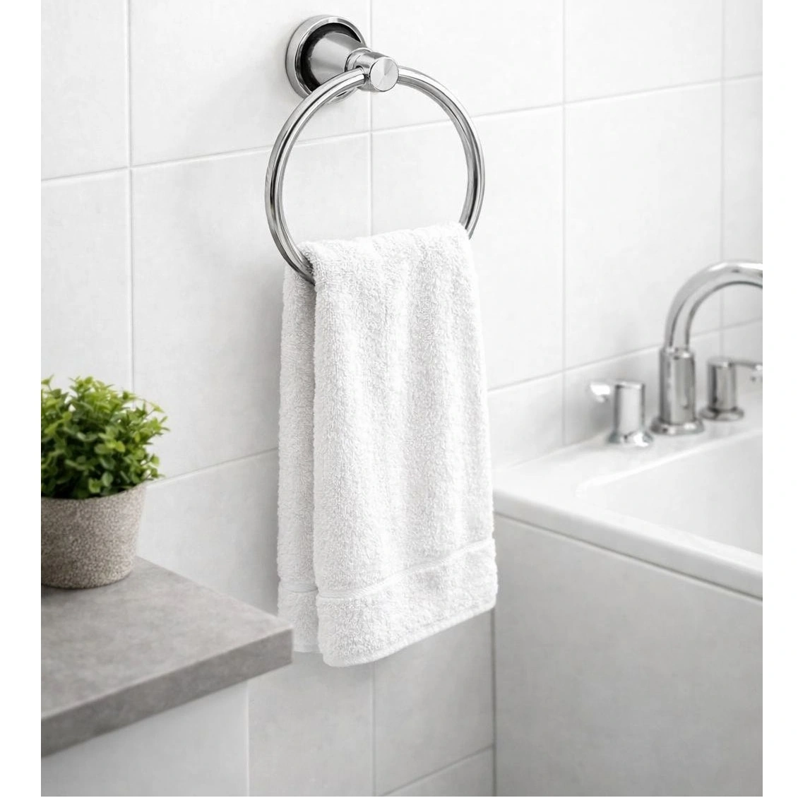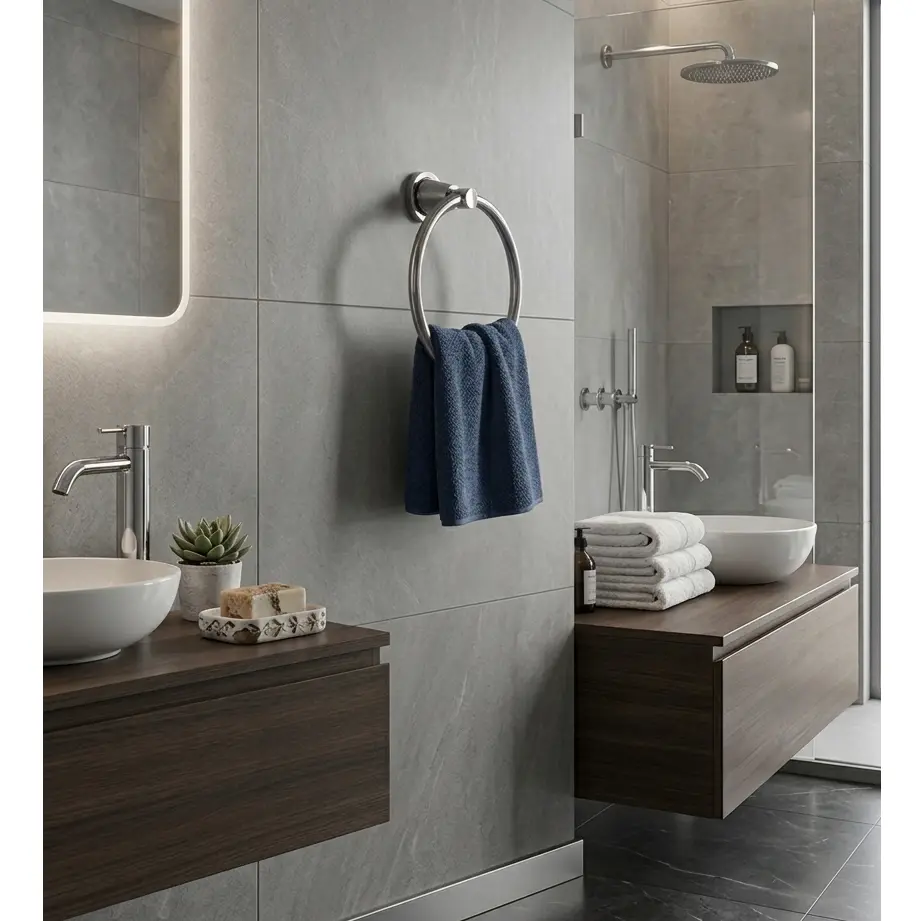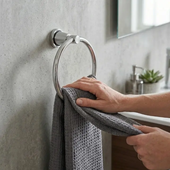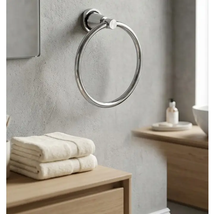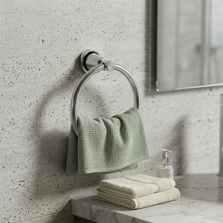 Uscare Igienică: Suspendarea prosopului pe inel asigură o distanțare, permițând aerului să circule și să usuce țesătura rapid.