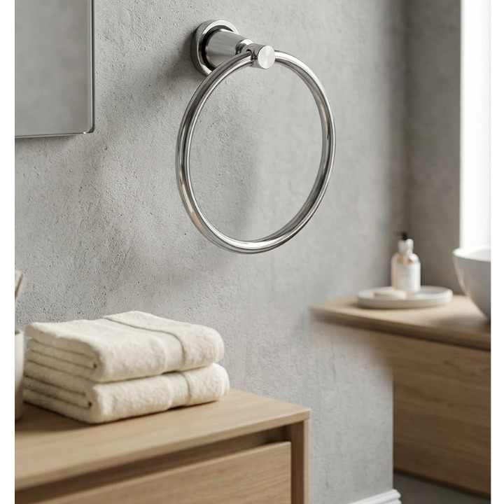 Adaugă un detaliu de eleganță discretă băii tale cu ajutorul suportului tip inel, conceput pentru prosoapele de mâini. Cu un design circular și un finisaj argintiu, acest accesoriu transformă un obiect utilitar într-o piesă de accent modernă. Este soluția ideală pentru zonele de lavoar unde spațiul este prețios, oferind o susținere ergonomică și un aspect vizual aerisit, specific interioarelor de tip hotel sau SPA.