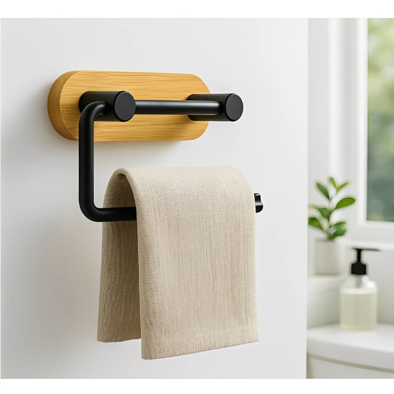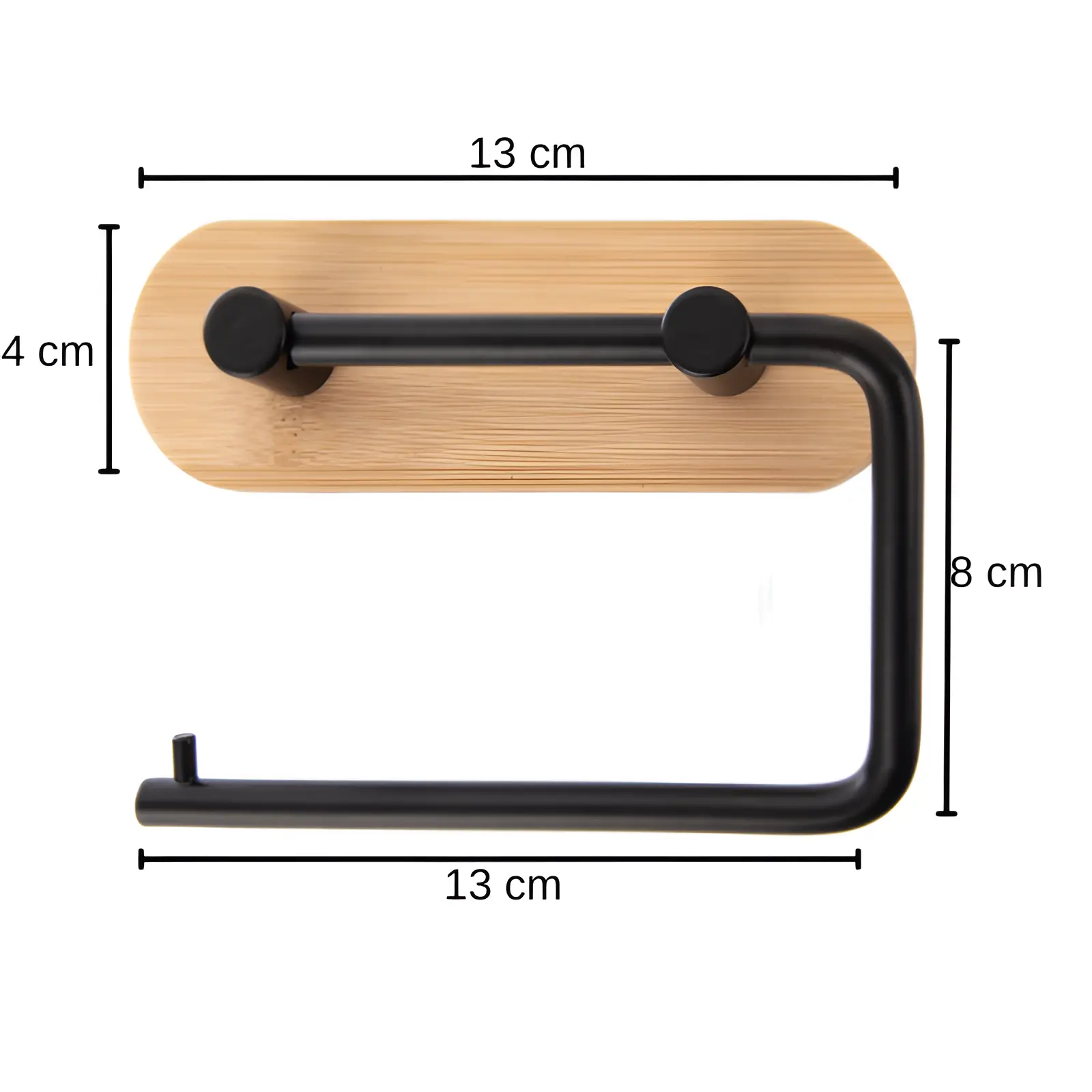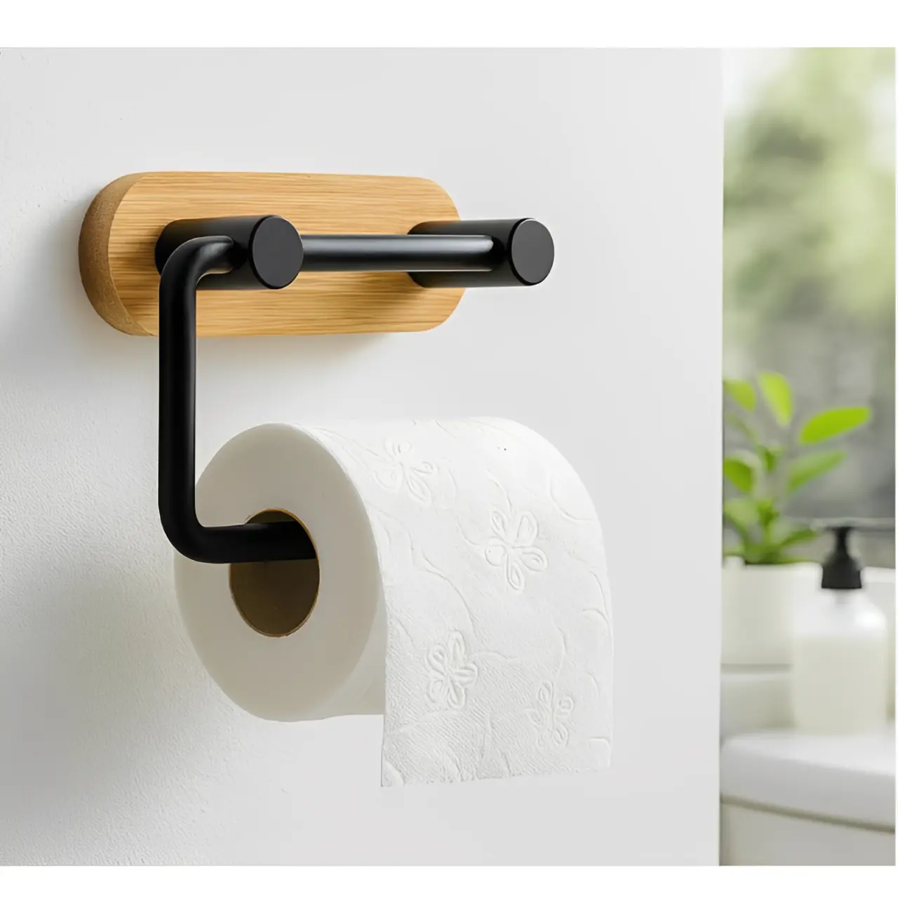 Acest suport pentru hârtie igienică îmbină duritatea metalului negru cu căldura naturală a bambusului, creând un contrast vizual sofisticat. Dimensiunile compacte de 13 x 10 cm îl fac ideal chiar și pentru băile de dimensiuni reduse, oferind un aspect ordonat și modern.
