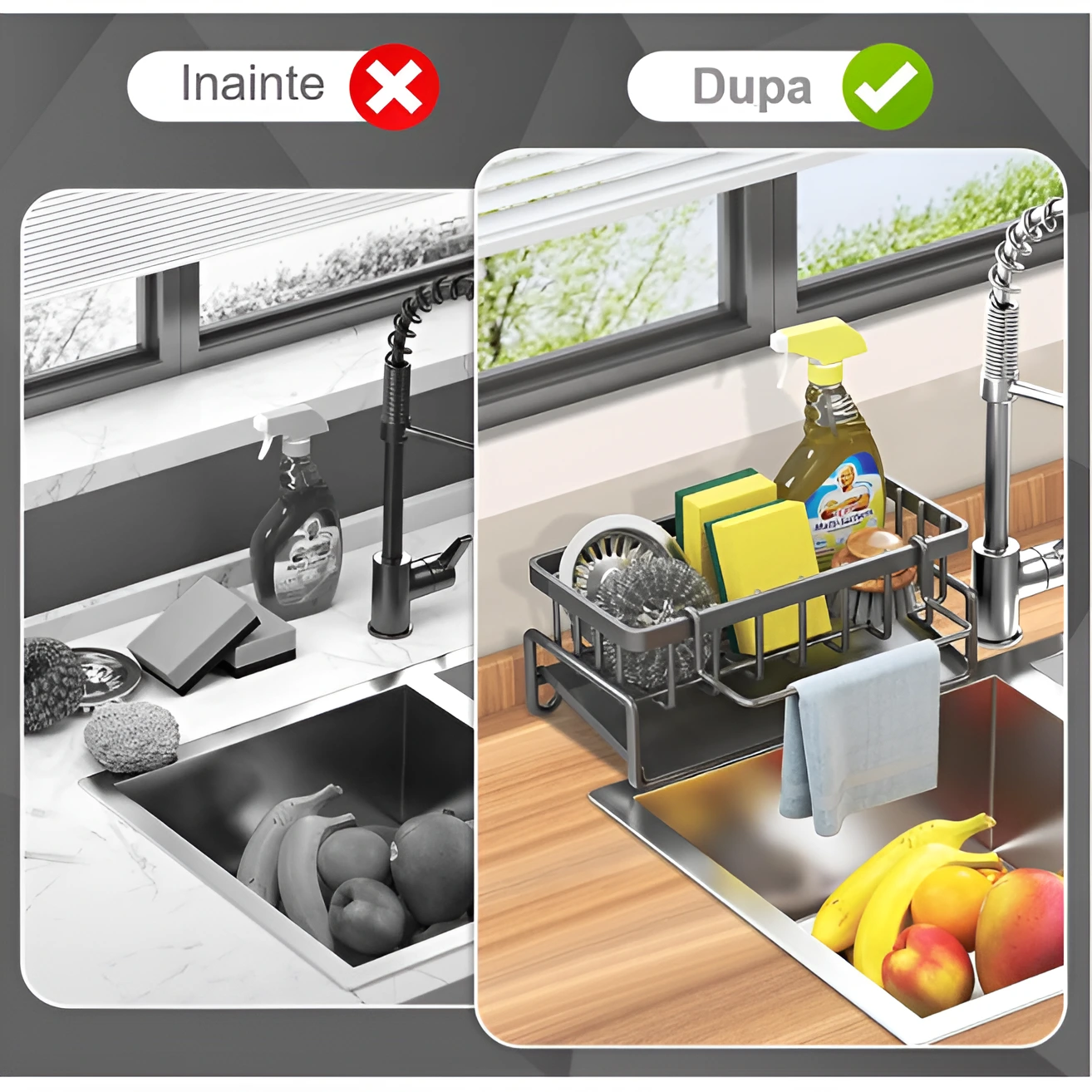 Economie de Spațiu: Dimensiunile compacte permit organizarea eficientă a ustensilelor de spălat într-un singur loc, eliberând marginea chiuvetei.