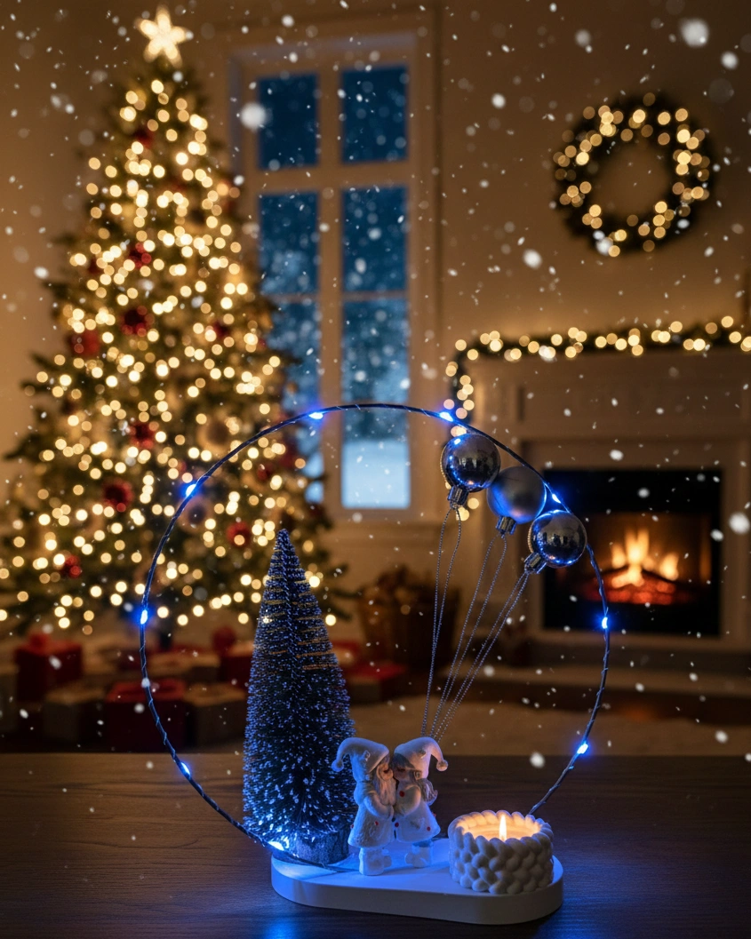 Element Romantic Central: Figurina delicată a unui cuplu sub bradul înzăpezit transformă acest aranjament într-un cadou perfect pentru partener/parteneră sau un simbol al uniunii pentru casa voastră.
