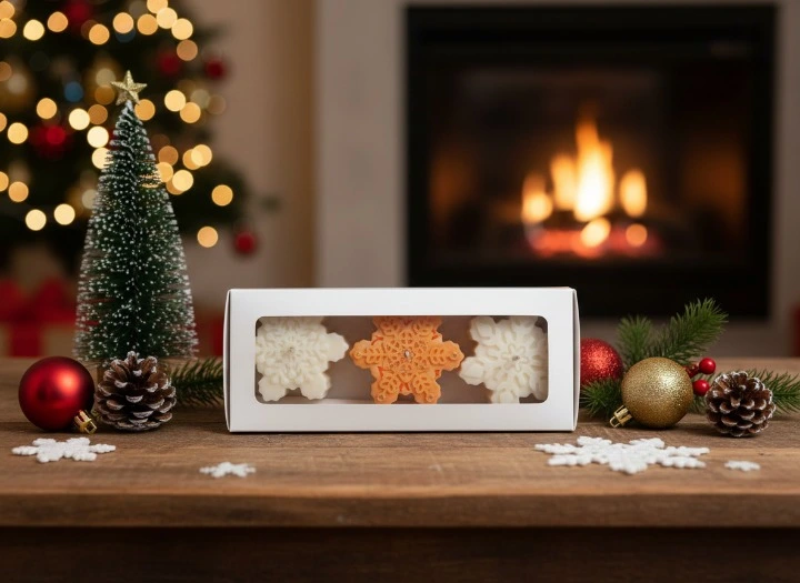 Lumanari Fulg de zapada turnate cu ceara naturala din soia, non-toxica, fitil impletit din bumbac pentru lipsa fumului, uleiuri esentiale pentru un parfum imbietor.