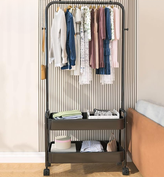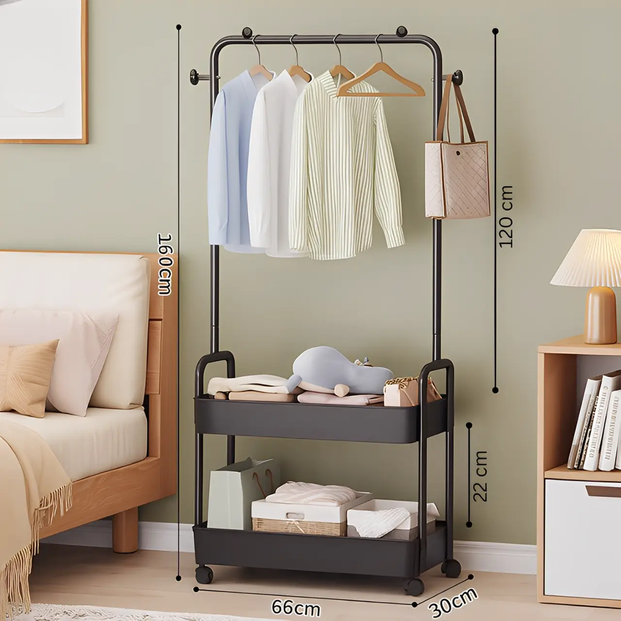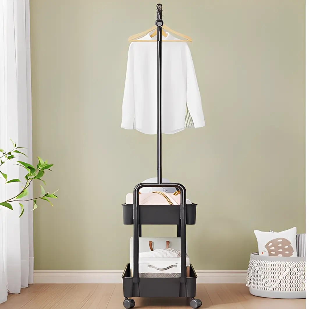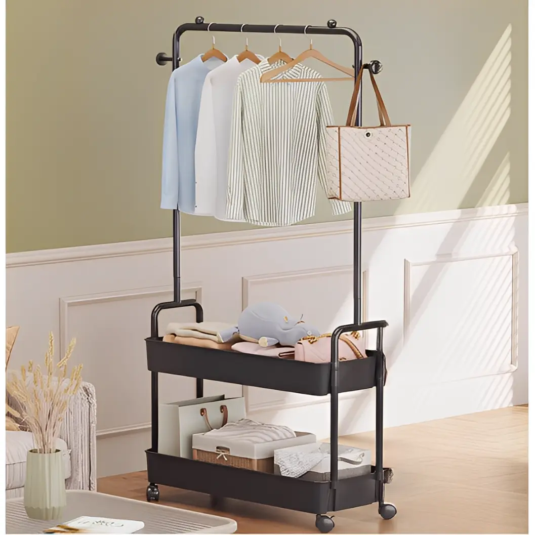 Cuier metalic mobil, soluția perfectă pentru organizare! Acest cuier elegant și practic îți oferă tot spațiul necesar pentru a-ți menține hainele în ordine. Cu cele 2 compartimente generoase și bara pentru umerașe, vei avea suficient loc pentru jachete, paltoane și accesorii. Roțile îi conferă mobilitate, astfel încât îl poți muta cu ușurință oriunde ai nevoie. Finisajul negru îl face ușor de integrat în orice decor.