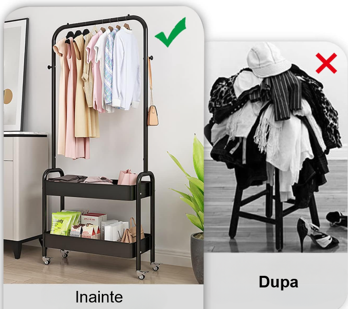 Mobilitate ușoară: Cuierul este prevăzut cu roți care permit mutarea ușoară dintr-o cameră în alta, fiind ideal pentru spații multifuncționale sau pentru reorganizarea locuinței.