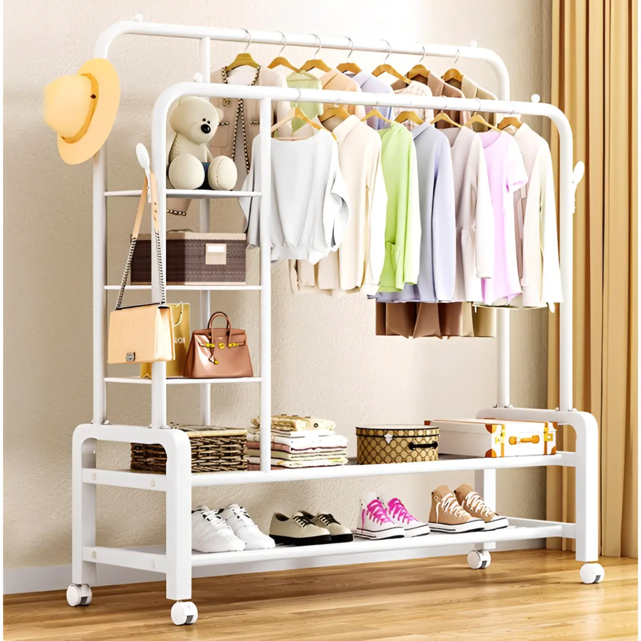Totul într-un Singur Loc: De la pantofii de la bază până la geanta atârnată lateral și rochia de pe bara înaltă, ai întreaga ținută gata de plecare într-un singur punct.