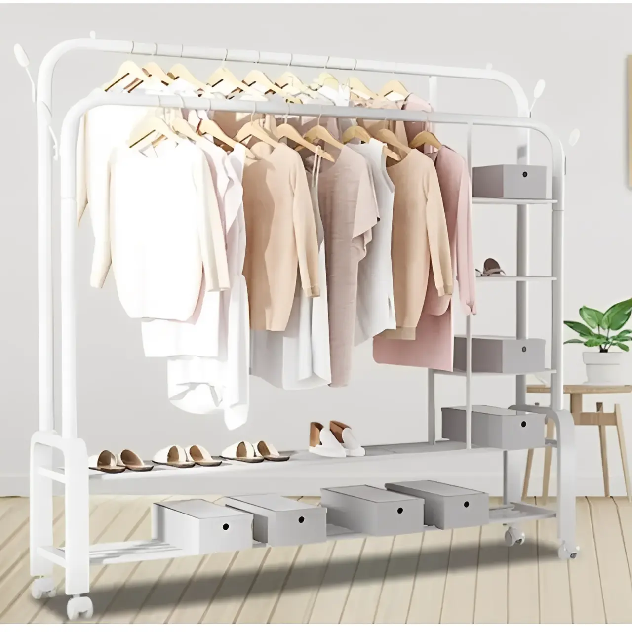 Suportul metalic alb cu 2 bare și roți este soluția pentru cei care refuză să aleagă între stil și funcționalitate. Este robust, ușor de mutat și oferă un spațiu de depozitare vertical impresionant, păstrând totul – de la pantofi la eșarfe – în ordine perfectă.