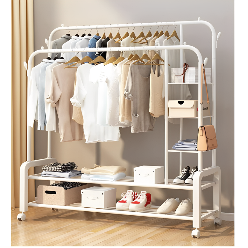 Sistem Dual de Suspendare: Două bare paralele poziționate la înălțimi diferite (130 cm și 150 cm) pentru a separa eficient cămășile de rochiile lungi sau paltoane.