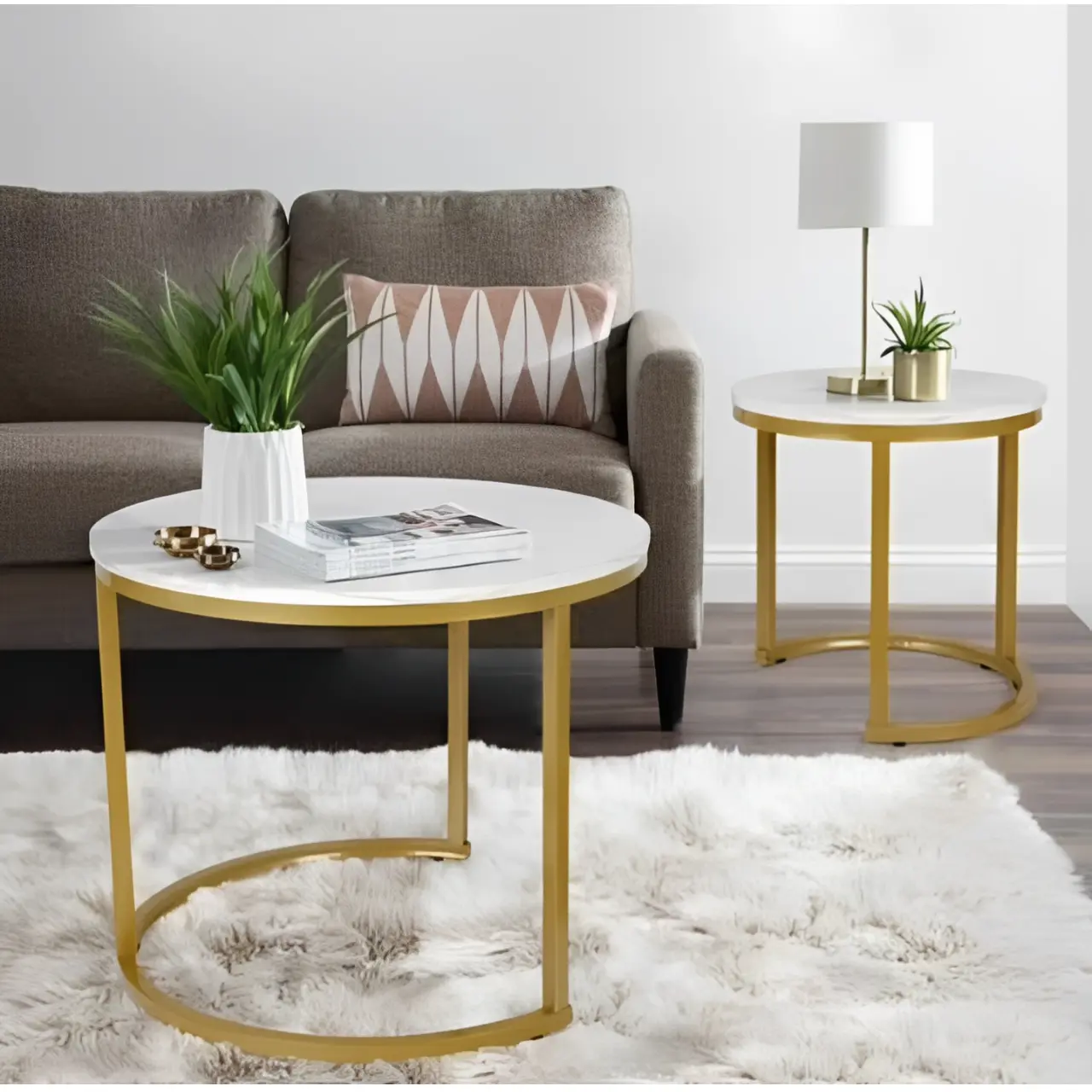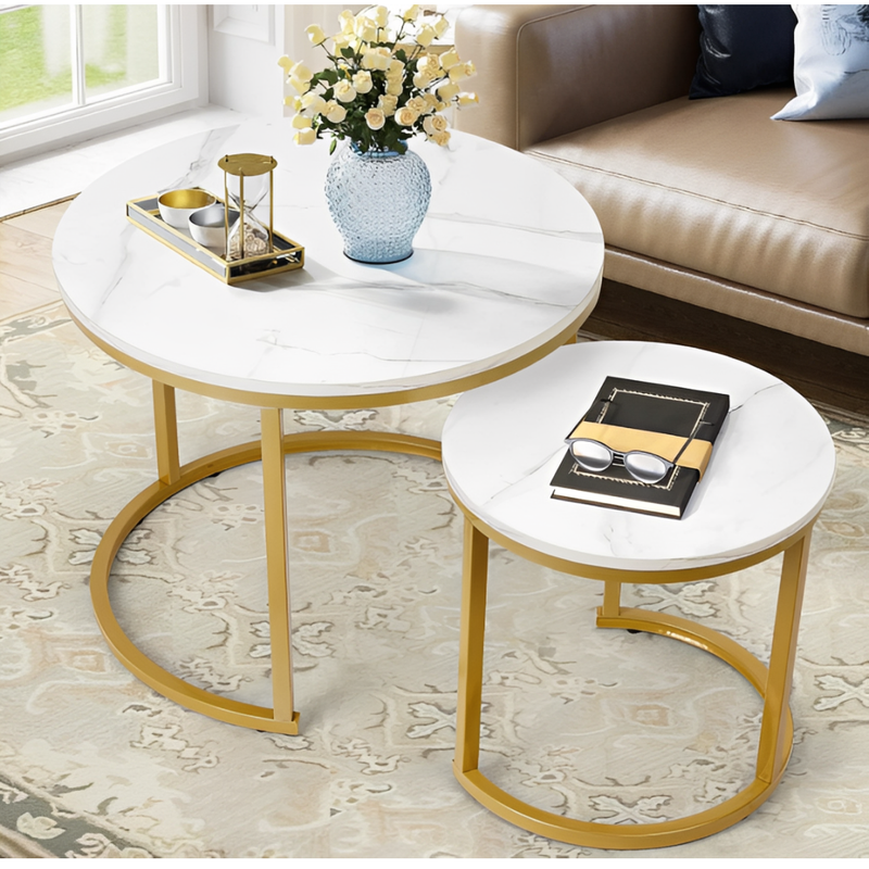 Redefinește estetica livingului tău cu un set de măsuțe de cafea conceput pentru a impresiona. Combinația atemporală de alb și auriu transformă orice spațiu obișnuit într-un decor desprins din revistele de design interior. Datorită designului lor circular și siluetei aerisite, aceste măsuțe aduc o notă de luminozitate și rafinament, fiind piesa centrală perfectă pentru momentele de relaxare.