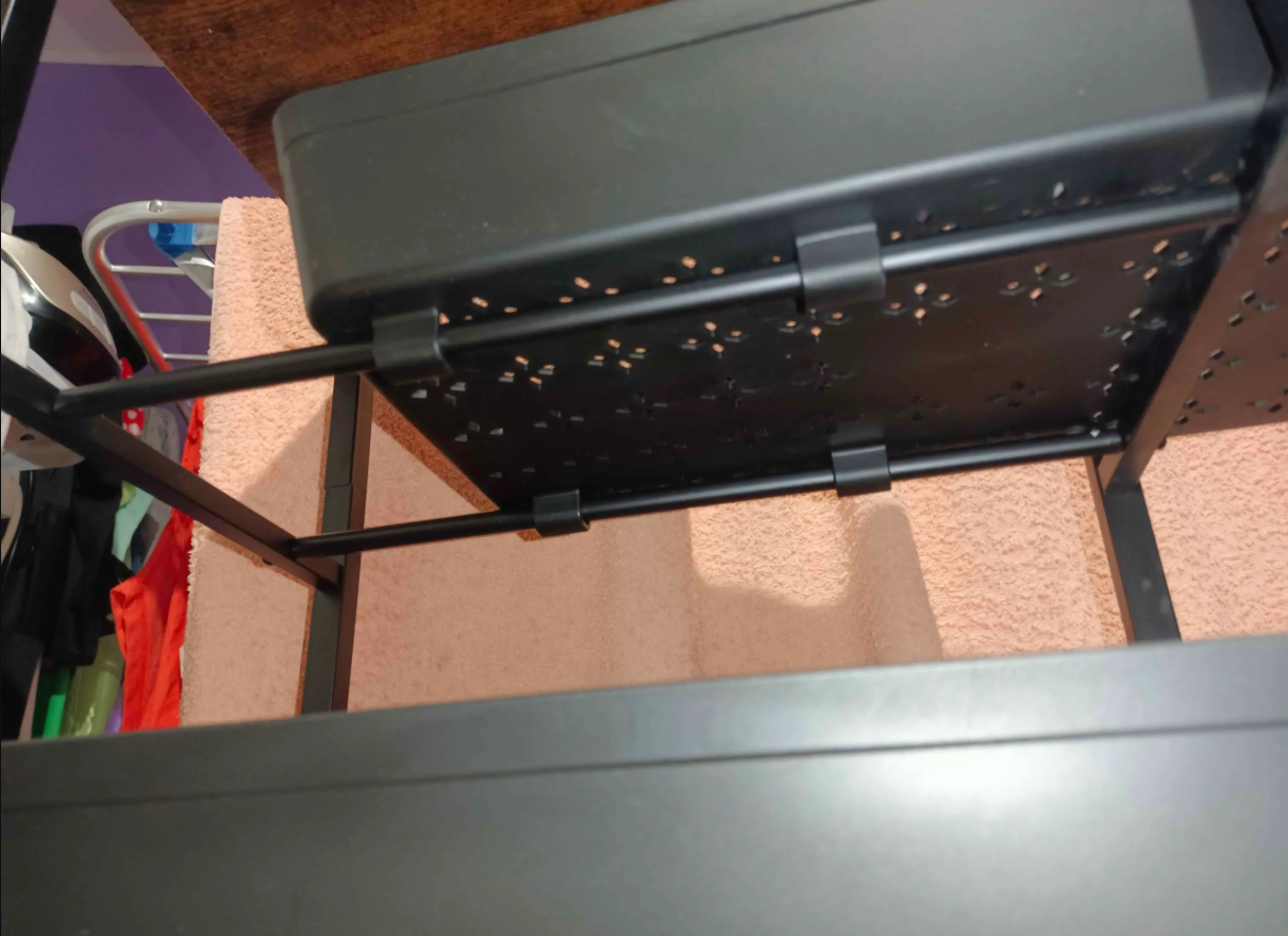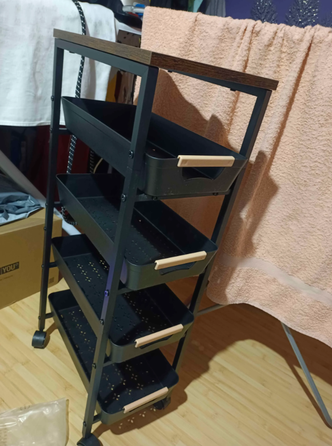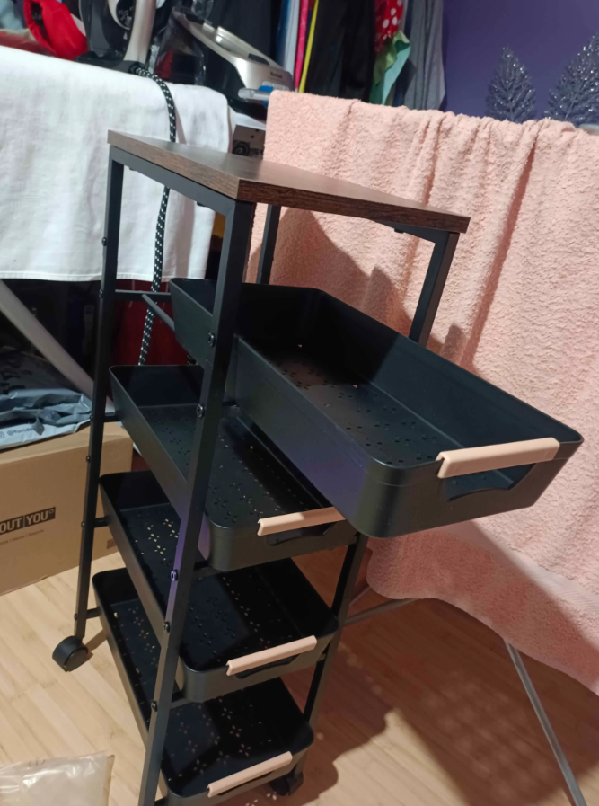 Acest suport multifuncțional este soluția perfectă pentru a crea un spațiu ordonat și elegant. Cu cele 4 rafturi glisante, poți personaliza organizarea în funcție de nevoile tale, iar roțile îți permit să muți suportul cu ușurință dintr-o încăpere în alta. Designul modern, în nuanțe de negru și maro, se integrează perfect în orice decor.