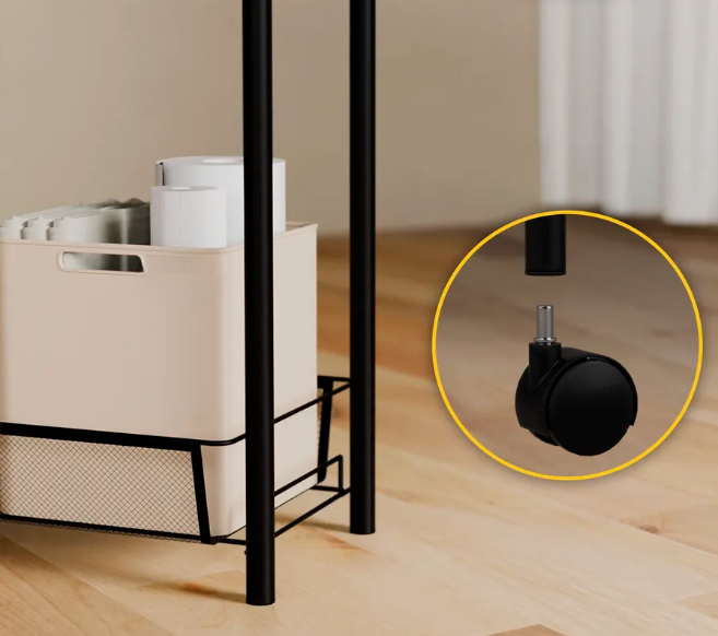 Mobilitate sporită: Datorită roților cu care este dotat, poți muta raftul cu ușurință oriunde ai nevoie, fără efort, având acces rapid la toate lucrurile tale.