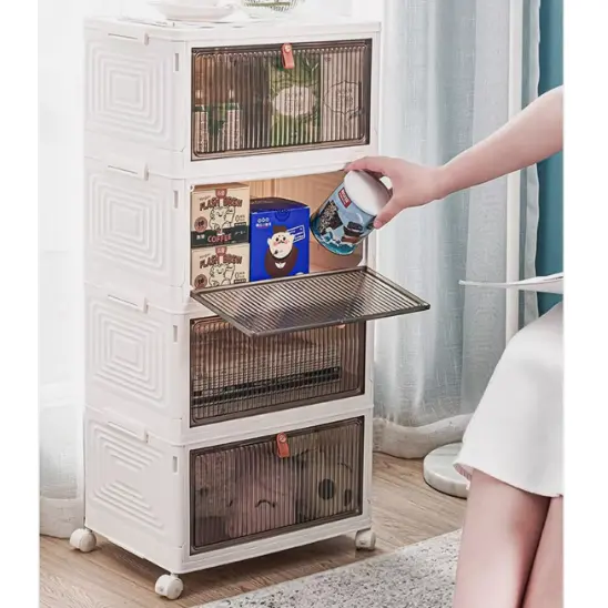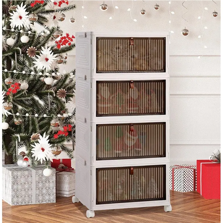 Raft pliabil de depozitare, 4 niveluri, din plastic, cu roti, organizare prin stivuire sau de sine statatoare, Alb/Gri, 39 x 28 x 80 cm