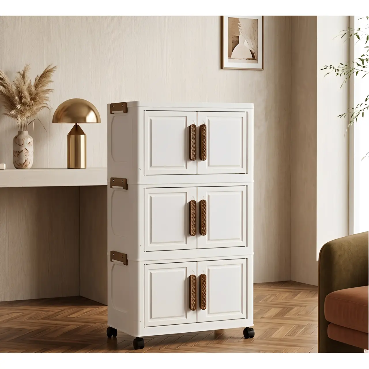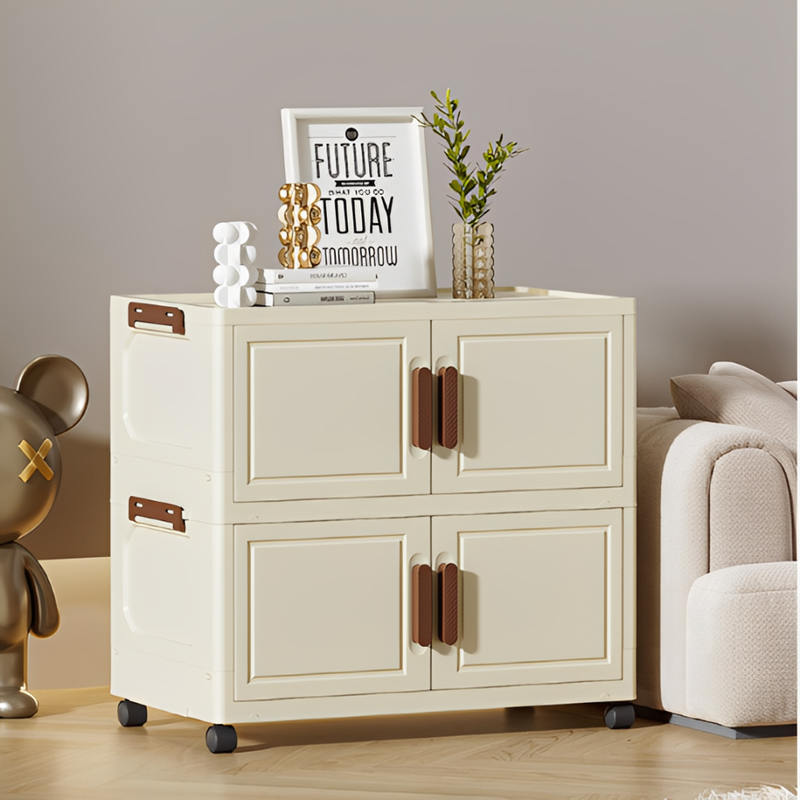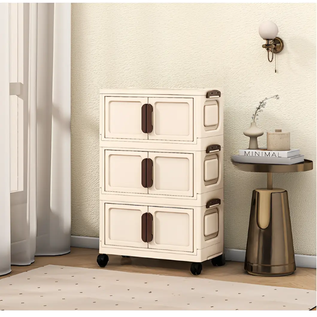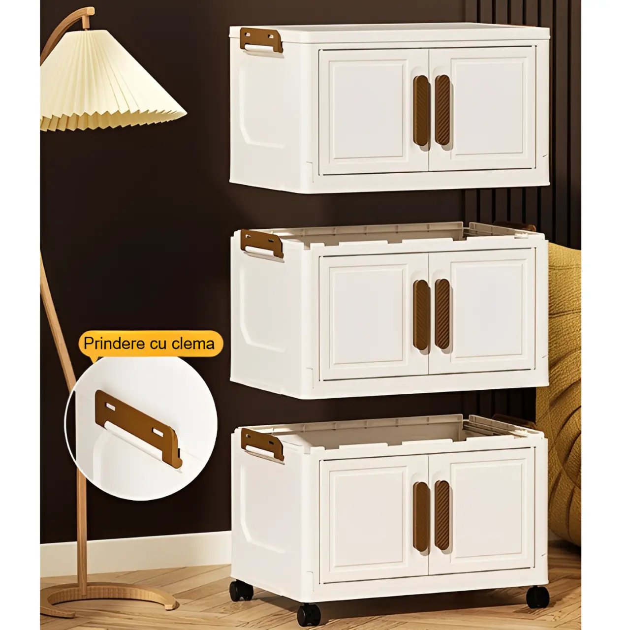 Redefinește modul în care îți gestionezi spațiul cu acest dulap pliabil de depozitare, o piesă de mobilier hibrid ce îmbină utilitatea unui raft industrial cu estetica unui bufet clasic. Spre deosebire de rafturile deschise, acest model tip dulap îți permite să ascunzi vizual obiectele depozitate, păstrând un aspect ordonat și minimalist în cameră.
