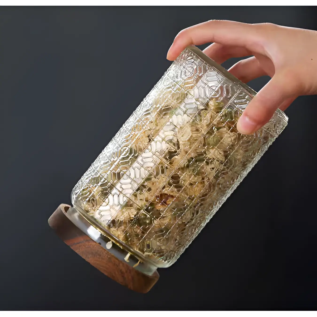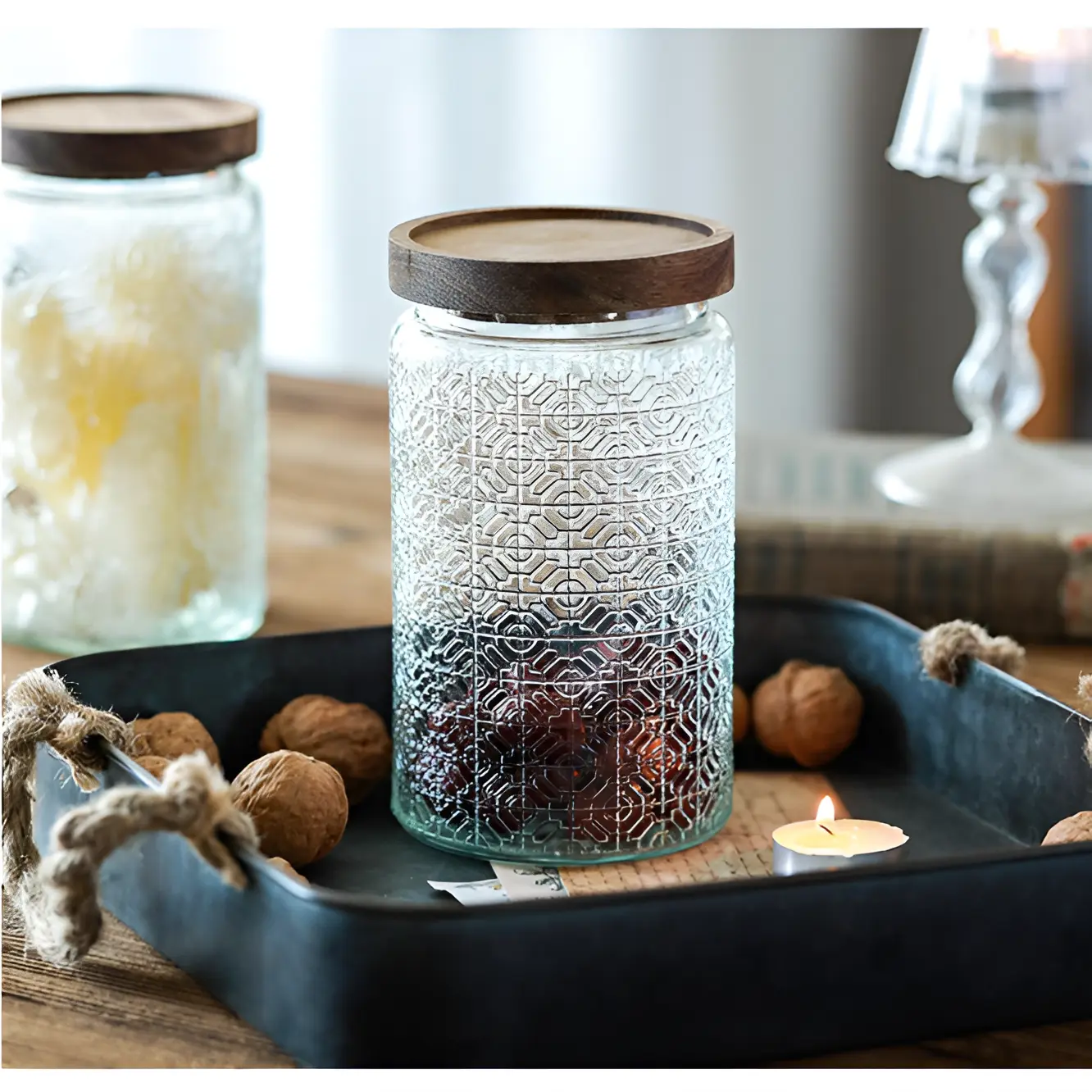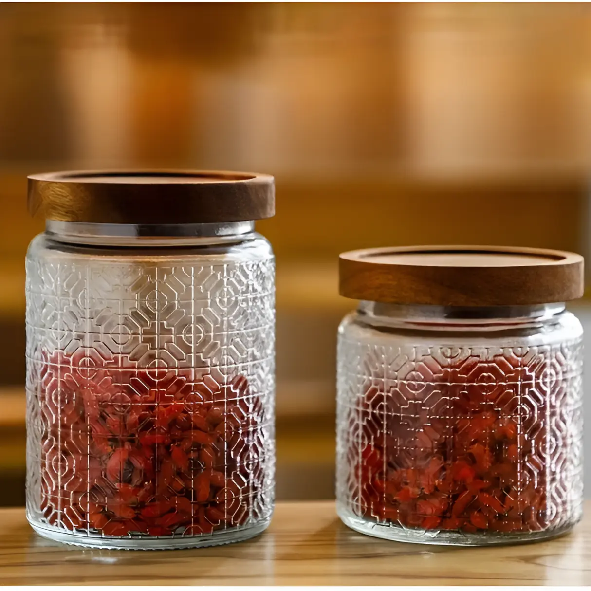 Redescoperă plăcerea de a găti într-o bucătărie perfect organizată! Acest set de 3 borcane din sticlă, cu texturi rafinate și capace cu aspect de lemn, este soluția ideală pentru a păstra prospețimea ingredientelor tale preferate, adăugând în același timp un aer rustic și sofisticat blatului tău de lucru.