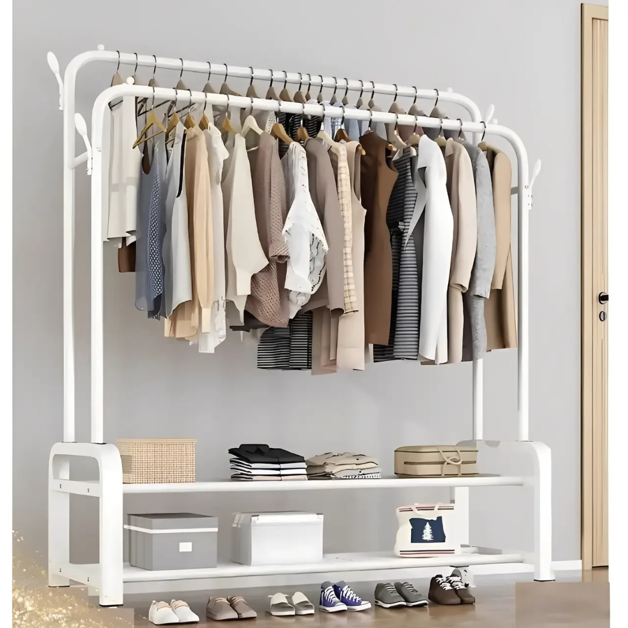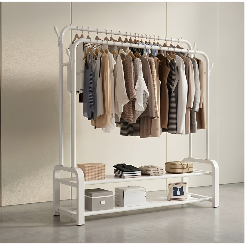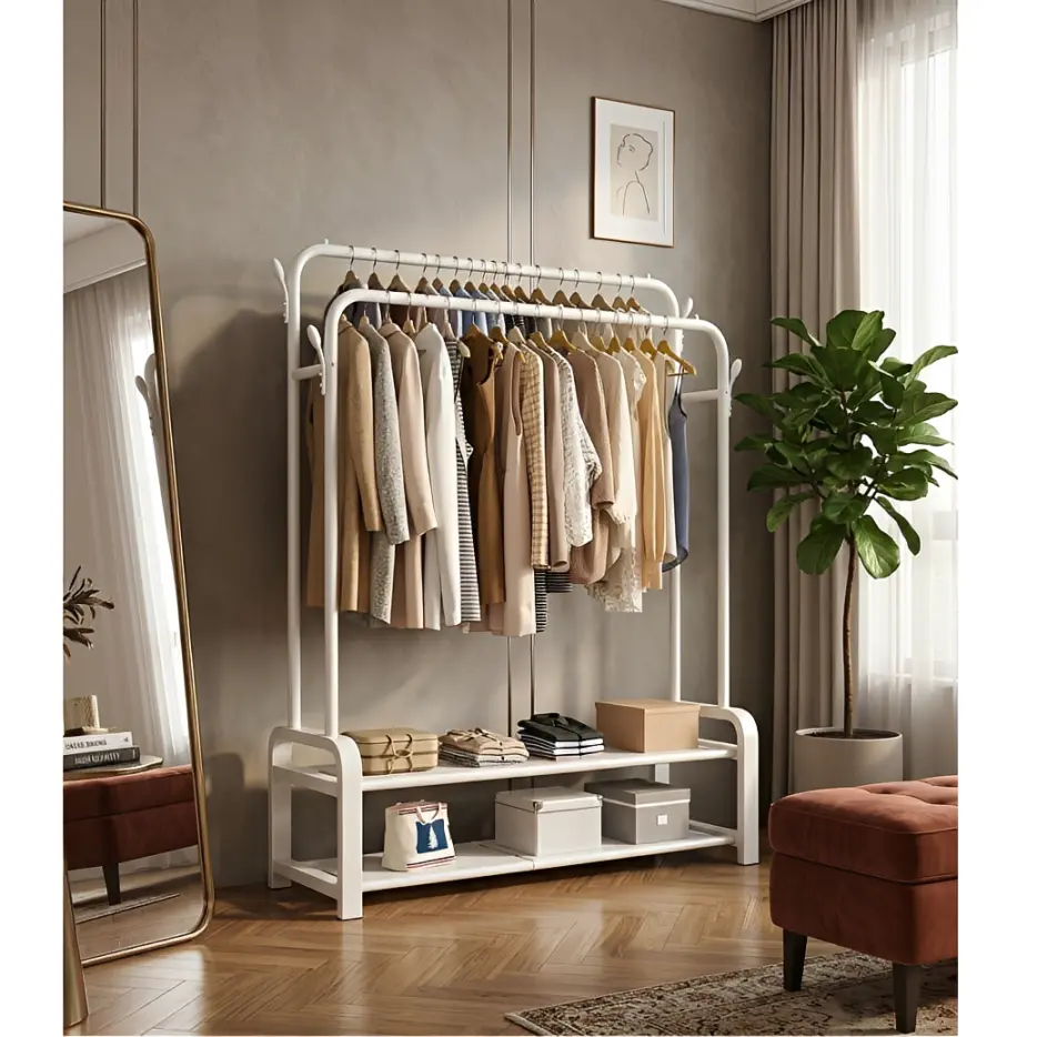 Uită de dulapurile ticsite și hainele șifonate! Acest suport metalic cu două bare este piesa centrală de care ai nevoie pentru a crea un colț de organizare eficient și estetic în casa ta. Este soluția ideală pentru a-ți pregăti ținutele săptămânale sau pentru a suplimenta spațiul de depozitare din hol sau dormitor.