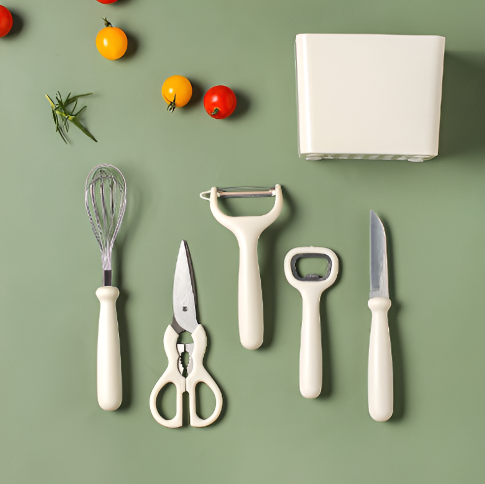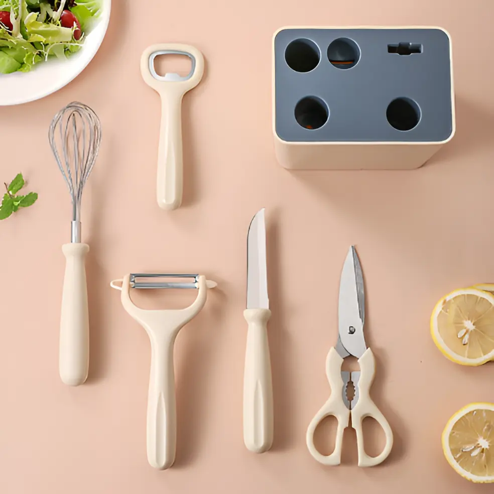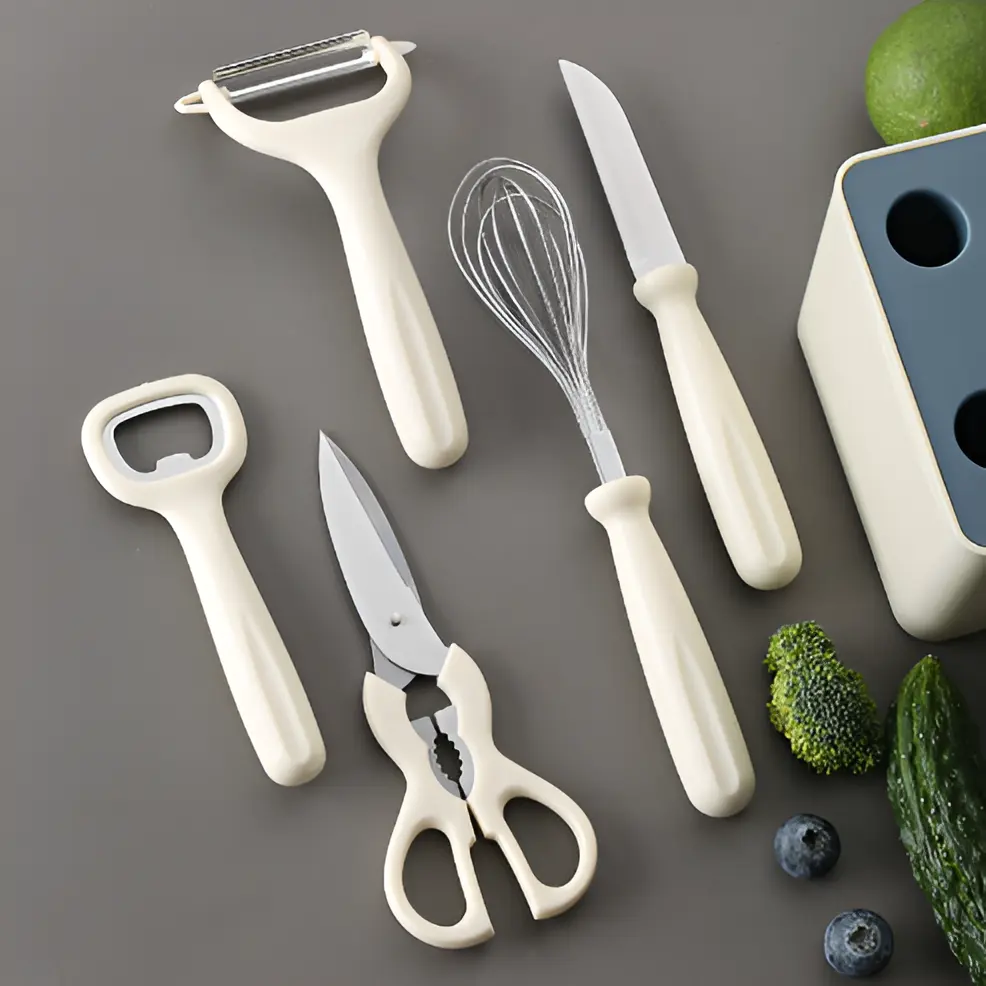 Pachet Complet: Include 1 cuțit universal, 1 foarfecă de bucătărie multifuncțională, 1 desfacător de sticle, 1 decojitor, 1 tel și 1 suport de ustensile.