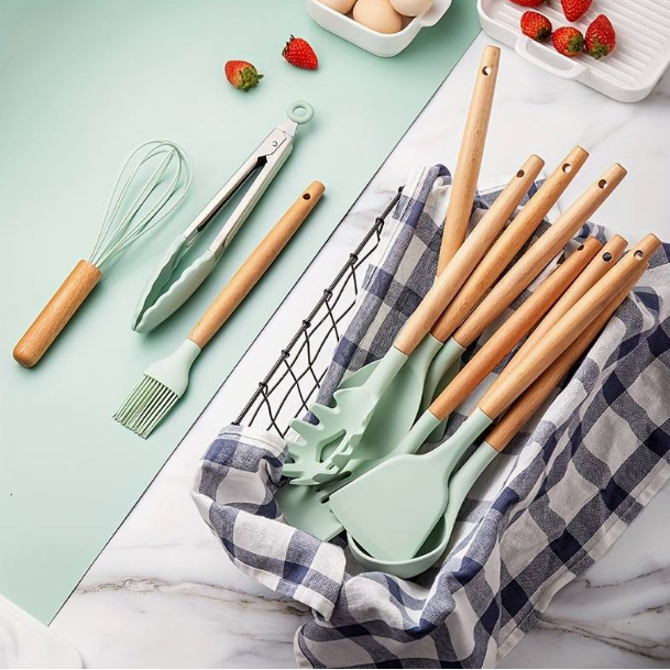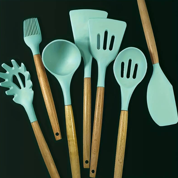 Acest set cuprinzător include toate ustensilele de care ai nevoie pentru a crea preparate delicioase: spatula, linguri, cleste, lingură de paste, tel, pensula, etc. Capetele din silicon sunt flexibile și rezistente la temperaturi mari, iar mânerele din lemn asigură o prindere sigură. Suportul completează setul și îți permite să păstrezi ustensilele ordonate.